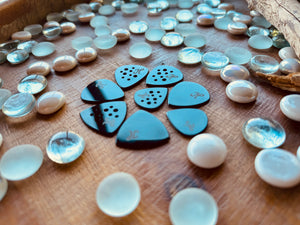 If you've ever played a pick for very long, you'll notice that your picks will start to wear down in a certain way. Our left-handed bevels imitate the worn in feeling that a left-handed person plays.