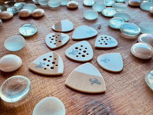 If you've ever played a pick for very long, you'll notice that your picks will start to wear down in a certain way. Our left-handed bevels imitate the worn in feeling that a left-handed person plays.