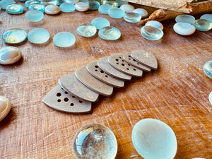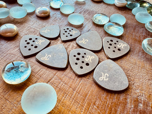 If you've ever played a pick for very long, you'll notice that your picks will start to wear down in a certain way. Our left-handed bevels imitate the worn in feeling that a left-handed person plays.